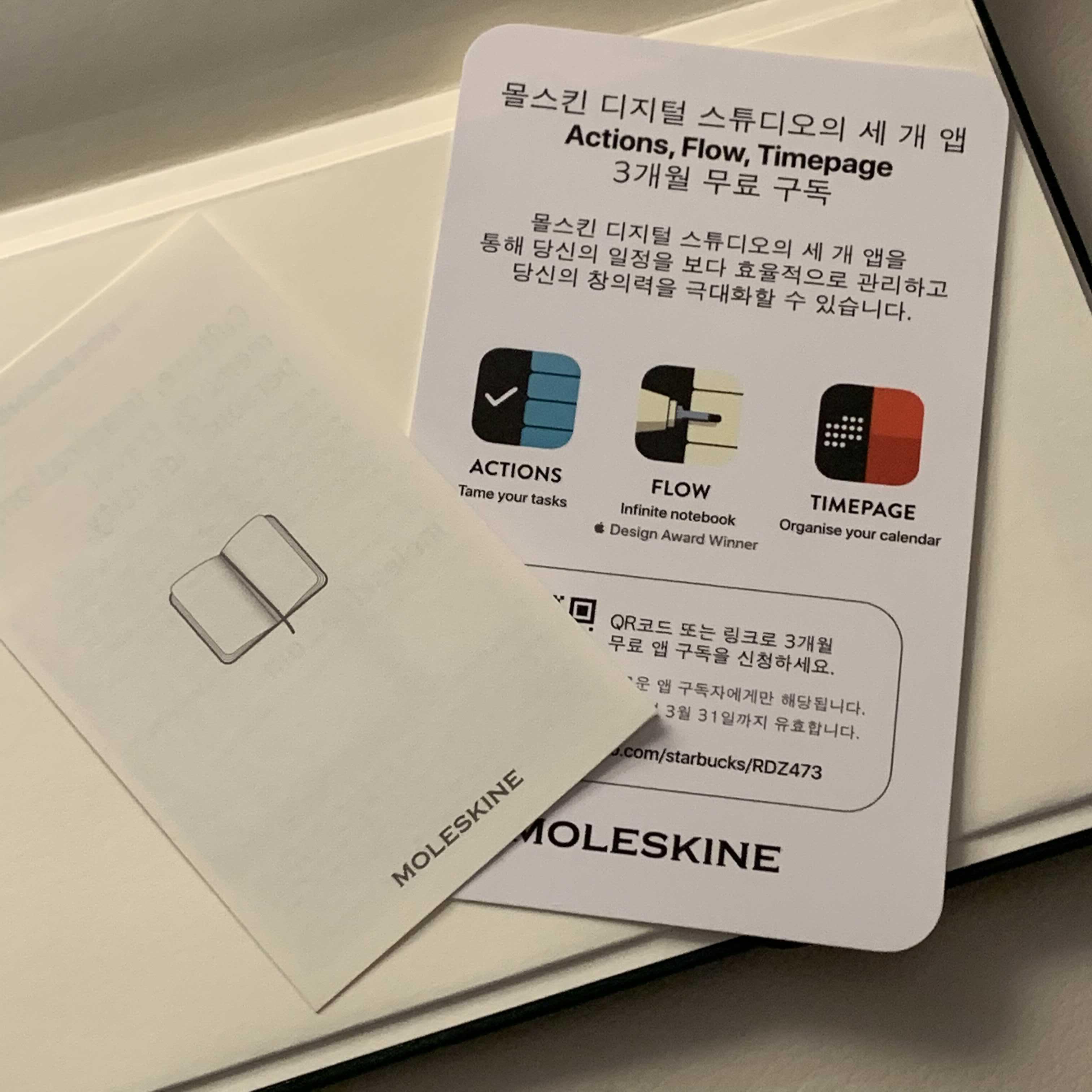 몰스킨 디지털 스튜디오의 3개 앱을 3개월동안 무료로 이용해볼 수 있는 큐알코드도 들어있어요. 평소 몰스킨을 좋아해서 앱을 한번 이용해봐야겠어요.