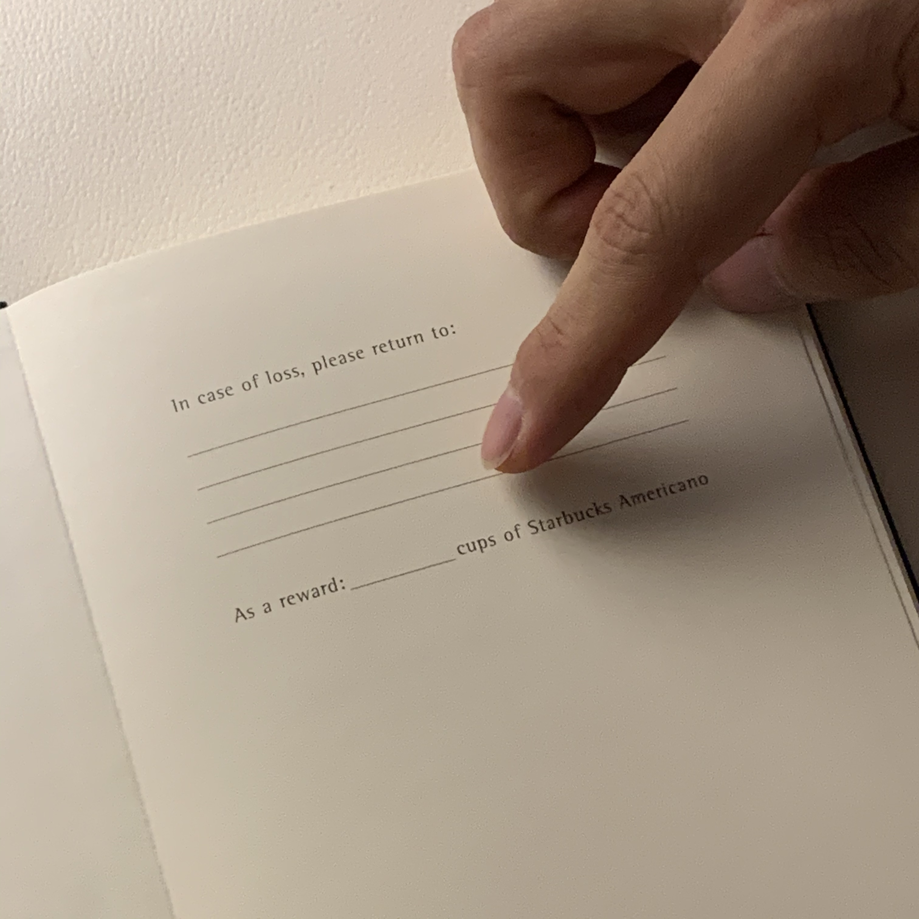 다이어리를 잃어버렸을 때 연락처를 기재하도록 되어 있구, 다이어리를 찾아준 분께 보상으로 몇잔의 스타벅스 아메리카노를 선물할 것인지 적을 수 있어요 ㅎㅎ